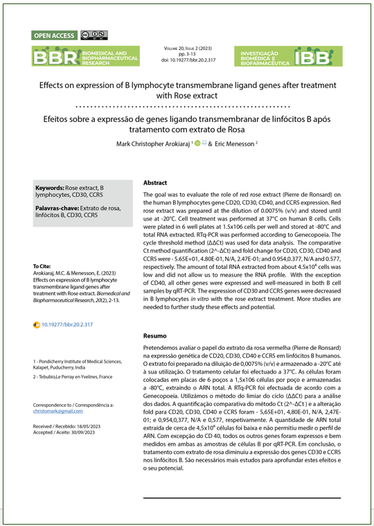 Effects on expression of B lymphocyte transmembrane ligand genes after treatment with Rose extract Mark Christopher Arokiaraj 1 1 - Pondicherry Institute of Medical Sciences, Kalapet, Puducherry, India 2 - Tebubio,Le Perray en Yvelines, France corresponding author: DOI: 10.19277/bbr.20.2.317 |